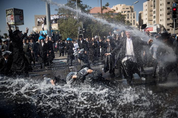 After hearing speeches from rabbis and community activists, the demonstrators proceeded to march through the streets, blocking traffic in numerous smaller thoroughfares. When the police moved in with water-cannons and mounted police to disperse the crowd, many lay down in the road in peaceful civil-disobedience.